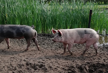 Eigenlijk is het Berkshire Varken in één mooie zin te omschrijven, het (H)eerlijke varken. Bij de Berkshire varkens van Puur Vlees staat het welzijn van de dieren voorop en is het de bedoeling dat de varkens op een zo natuurlijk mogelijke manier kunnen groeien. Het mooie van deze varkens van Puur Vlees is dat ze gevoed worden door het brood van Puur Brood. Ze krijgen geen toegevoegde voedingsmiddelen die de varkens niet nodig hebben om ze sneller te laten groeien, alles gaat natuurlijk. Het vlees van het Berkshire varken is een gemarmerd donkergekleurd stuk vlees met een hele mooie sappige malsheid. Het vlees smaakt heel bijzonder, het heeft een zoete smaak over zich heen. Het blijft zelfs enorm goed wanneer het meerdere dagen in de koeling ligt, het verliest vrijwel geen vocht. Daarom kiest Puur Vlees voor het Berkshire varken.